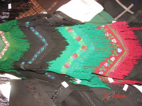 A szövet és a selyem vállkendőket gyakran díszítették hímzéssel, színes virágkoszorúval.