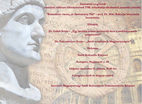 Látogasson el rendezvényünkre és ismerje meg a magyarországi szerbek kultúráját! A Magyarországi Szerb Kulturális és Dokumentációs Központ szeretettel meghívja december 13-i eseményére, melyet a milánói ediktum 1700 éves kiadása alkalmából rendeznek meg. Az est folyamán bemutatják dr. Misa Rakocija „Konstantin városa, az ókeresztény Nis” című kötetét.