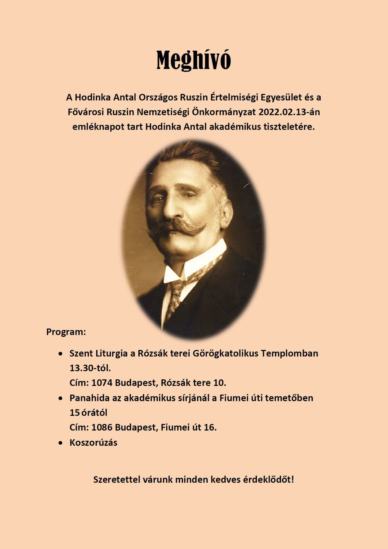 A Hodinka Antal Országos Ruszin Értelmiségi Egyesület és a Fővárosi Ruszin Nemzetiségi Önkormányzat szeretettel meghívja a tisztelt képviselőket, ismerősöket és érdeklődőket a Hodinka Antal akadémikus tiszteletére rendezett emléknapra.