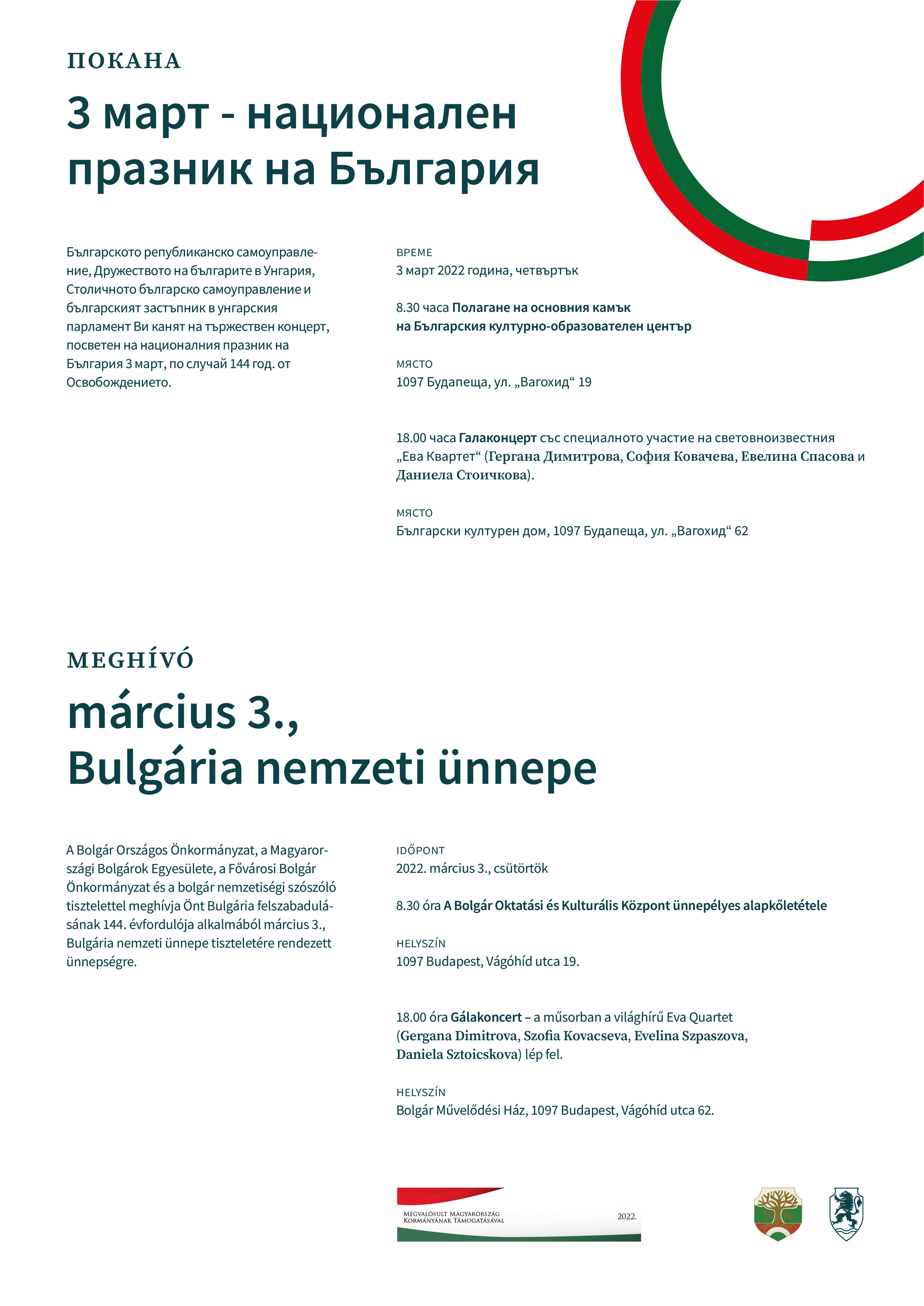 A Bolgár Országos Önkormányzat, a Magyarországi Bolgárok Egyesülete, a Fővárosi Bolgár Önkormányzat és a bolgár nemzetiségi szószóló tisztelettel meghívja Önt Bulgária felszabadulásának 144. évfordulója alkalmából március 3., Bulgária nemzeti ünnepe tiszteletére rendezett ünnepségre.