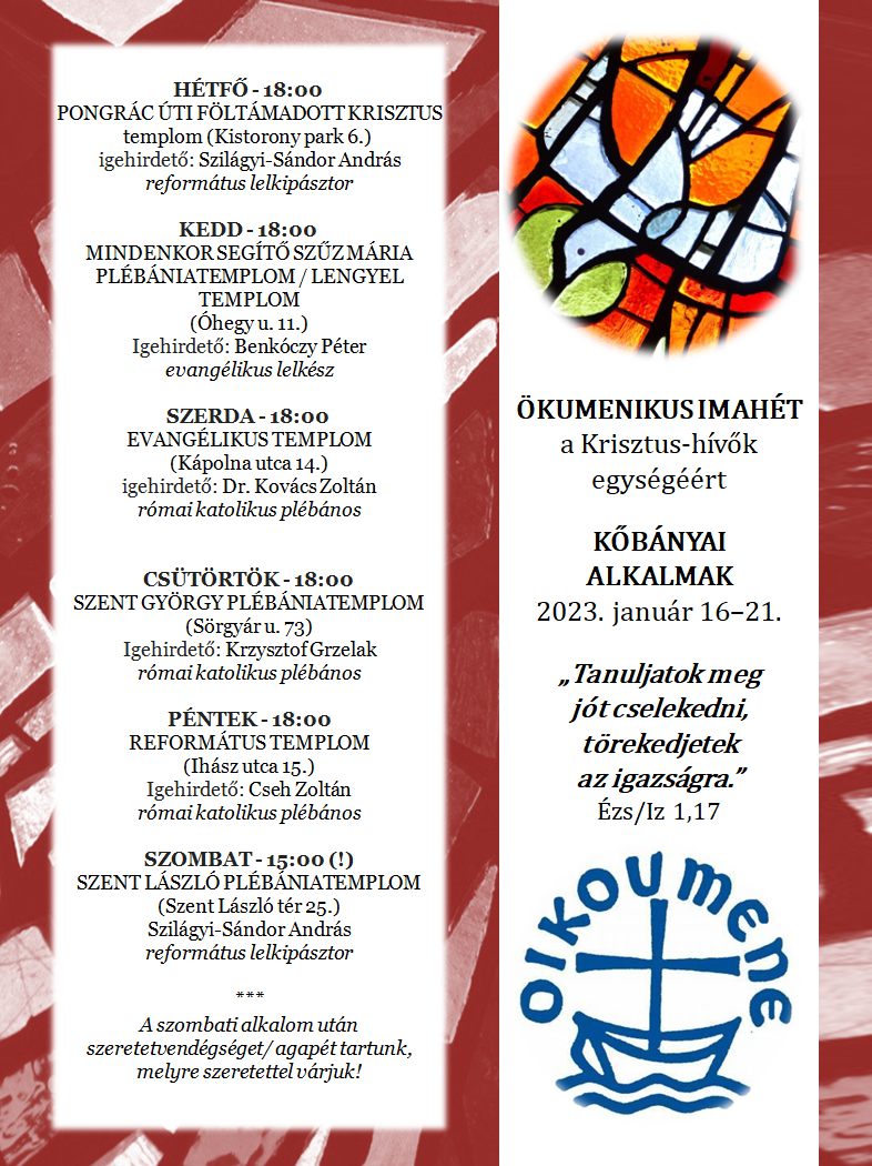 A Lengyel Perszonális Plébánia (Mindenkor Segítő Szűz Mária templom) adott otthont az ökumenikus imahét keddi napján a közös imádságnak. Idén január 17-én 13. alkalommal vettek részt a hívek ökumenikus istentiszteleten. A keresztények egységéért együtt imádkoztak Cseh Zoltán római katolikus plébános, Benkóczy Péter evangélikus lelkész, Szilágyi-Sándor András református lelkipásztor, Krzysztof Grzelak római katolikus plébános.