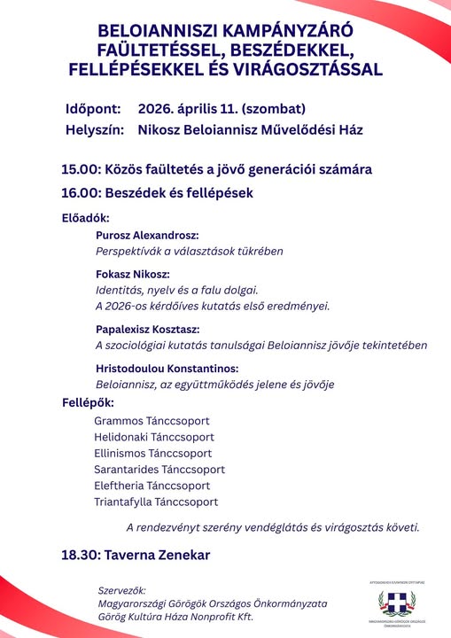 2026. április 11-én Beloianniszban kampányzáró rendezvényt szervez a Magyarországi Görögök Országos Önkormányzata. A helyszínre induló busz a Népliget-Planetárium előtti szakaszától indul. Aki az utazásra jelentkezett, kérjük 13.15-kor gyülekezzen a kijelölt helyen. A busz 13.30.-kor indul.